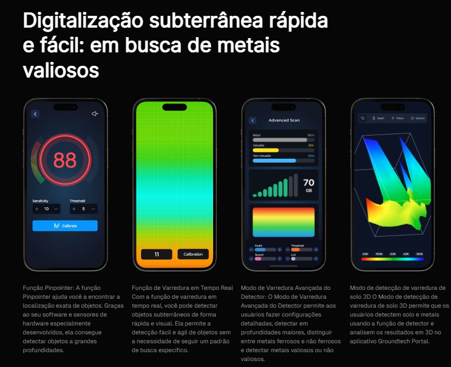 Escaneamento 3D do solo, Escaneamento ao vivo, Localizador de pontos, Escaneamento rápido do detector, Escaneamento avançado do detector, Escaneamento 3D do detector, Escaneamento automático de resistividade, Escaneamento manual de resistividade |