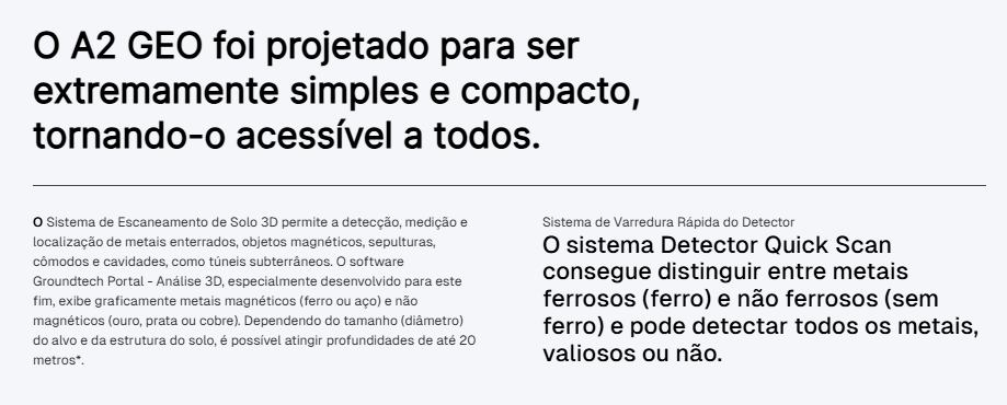 O Groundtech A2 GEO 3D é um scanner portátil avançado projetado para caça ao tesouro profissional. Este equipamento combina tecnologia de indução por pulsos com um poderoso sistema de imagem tridimensional. Por esse motivo, oferece aos usuários uma ferramenta precisa para encontrar objetos enterrados em vários tipos de terreno. Graças ao seu design funcional, qualquer navegador pode obter resultados claros rapidamente.