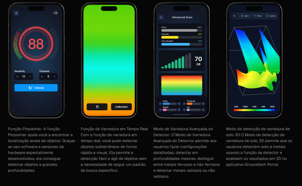 O Groundtech GR-4 é um scanner de solo 3D avançado com tecnologia MFS-2 e profundidade de detecção de até 15 metros. Operado por aplicativo para Android/iOS, é ideal para localizar ouro, metais, cavidades e tesouros enterrados com alta precisão.