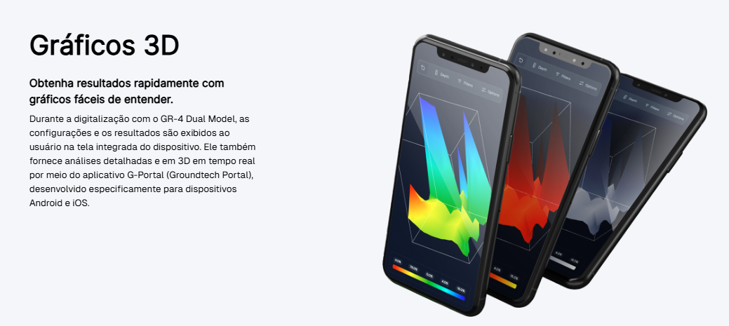 Projetado para durabilidade em campo, o Groundtech GR-4 apresenta uma construção robusta e portátil, permitindo que os usuários operem confortavelmente durante longas sessões de escaneamento. O sistema é otimizado para diversas aplicações, incluindo busca por tesouros, pesquisa arqueológica, detecção de cavidades e mapeamento subterrâneo .